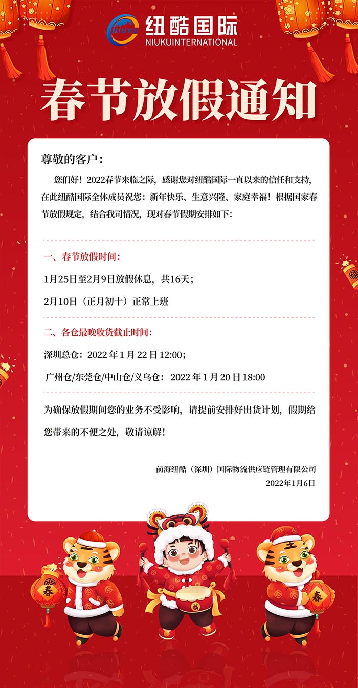 2022年紐酷國際春節(jié)放假通知。2022年春節(jié)來臨之際,感謝您對紐酷國際一直以來的信任與支持。在此,紐酷國際全體成員祝福您:新年快樂、生意興隆、家庭幸福!根據(jù)國家規(guī)定和我司具體情況,現(xiàn)對春節(jié)假期安排如下: