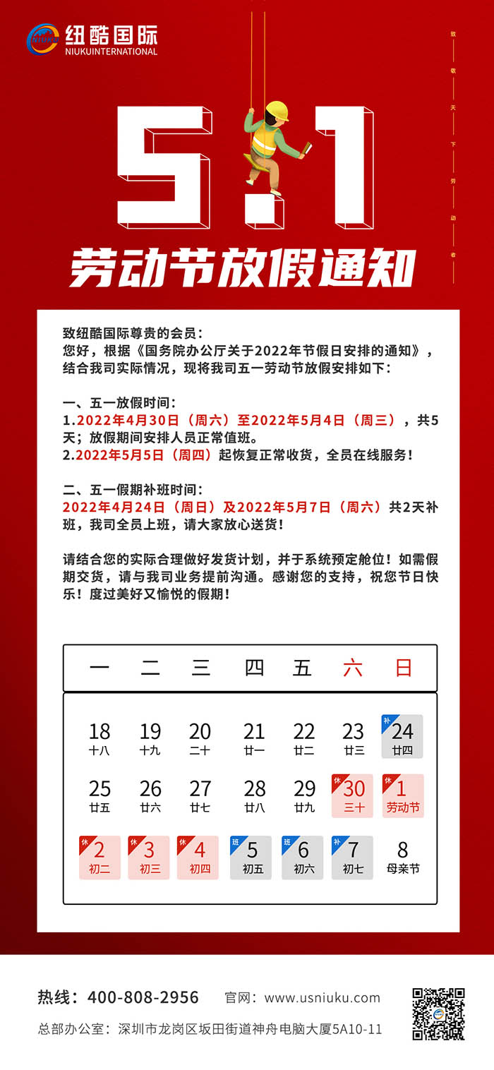 致紐酷國際尊貴的會員:五一放假時間: 1.2022年4月30日(周六)至2022年5月4日(周三),共5天;放假期間安排人員正常值班。 2.2022年5月5日(周四)起恢復正常收貨,全員在線服務!