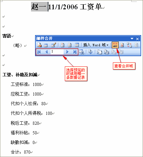 插入合并域之后,當(dāng)然應(yīng)該先看看合并的效果如何。所以點(diǎn)工具欄上的“查看合并域”按鈕看看合并的結(jié)果是什么樣的:
