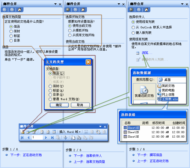 圖中可以看到,向?qū)У牡谝徊胶偷诙娇梢杂霉ぞ邫谥械牡谝粋€按鈕“設(shè)置文檔類型”代替;而第三步,也可以由工具欄上的第二個按鈕“打開數(shù)據(jù)源”來完成。這里順便說一下,如果當(dāng)前文檔你不想讓它繼續(xù)做為郵件合并的模板(也就是想讓它脫離與數(shù)據(jù)表格的關(guān)聯(lián))時,只需使用工具欄上的“設(shè)置文檔類型”按鈕將其設(shè)置為“普通Word文檔”即可,這一點(diǎn)用向?qū)遣荒苻k到的。