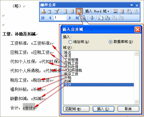 先選中模板標(biāo)題行的“XXX員工”,點(diǎn)擊工具欄上的第6個按鈕“插入域”,打開“插入合并域”對話框并在其中選擇“姓名”,點(diǎn)擊“插入”按鈕,并關(guān)閉對話框;然后選擇“XX年XX月”,同樣的辦法插入“年月”域;以此類推,依次將各域插入到適當(dāng)位置,如下圖所示: