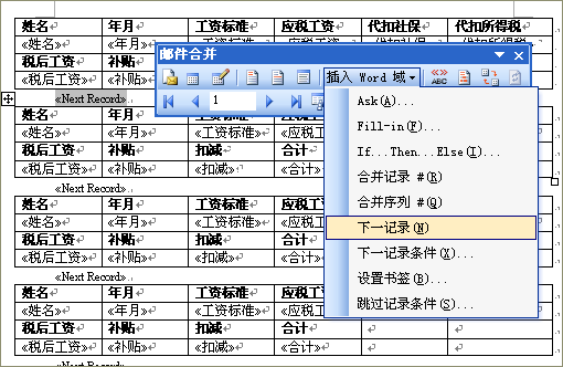 現(xiàn)在從第二工資條表格開始,每一個工資條表格前面都插入一個Word域“下一記錄”。注意最后一個表格后面不要加“下一記錄”Word域,因為翻頁的時候,Word自己會往下跳一記錄的。再次預(yù)覽,結(jié)果就正確了: